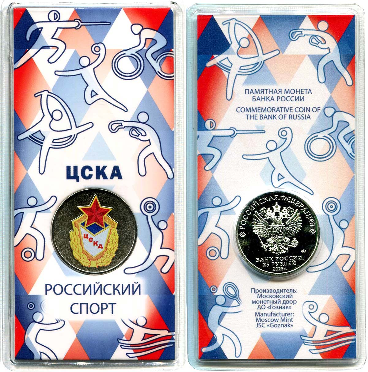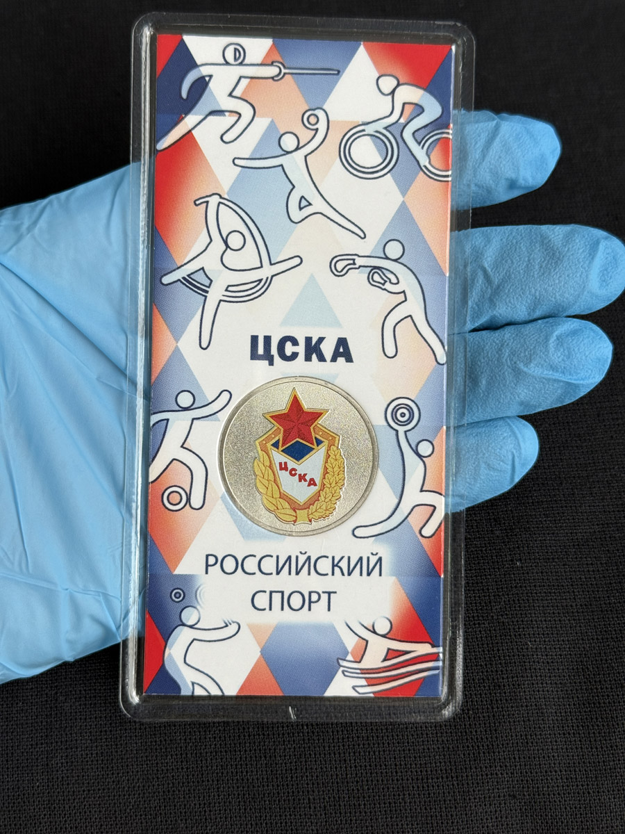 Цветные 25 рублей ЦСКА – это монета, на которую нанесено цветное покрытие, и сама монета для сохранности запакована в запаянный пластиковый блистер, который защищает монету и придаёт ей как коллекционный, так и подарочный вид. Монета входит в серию Российский спорт, которая стартовала в 2025 году.