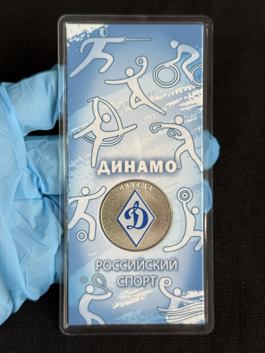 Цветные 25 рублей Динамо – это монета, на которую нанесено цветное покрытие, и сама монета для сохранности запакована в запаянный пластиковый блистер, который защищает монету и придаёт ей как коллекционный, так и подарочный вид. Монета входит в серию Российский спорт, которая стартовала в 2025 году.